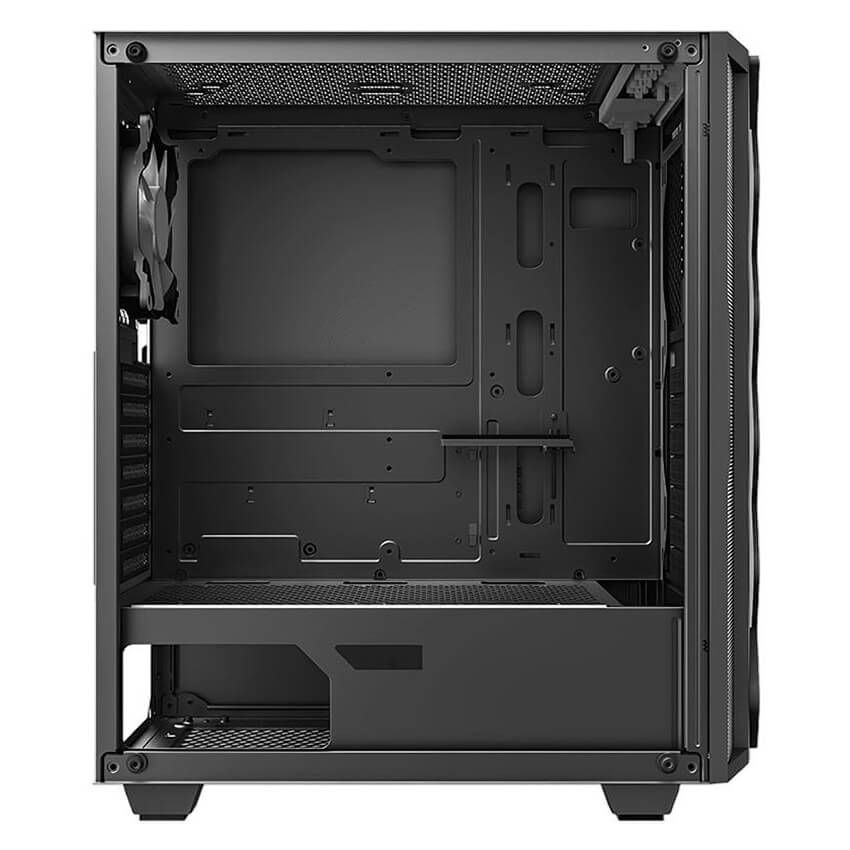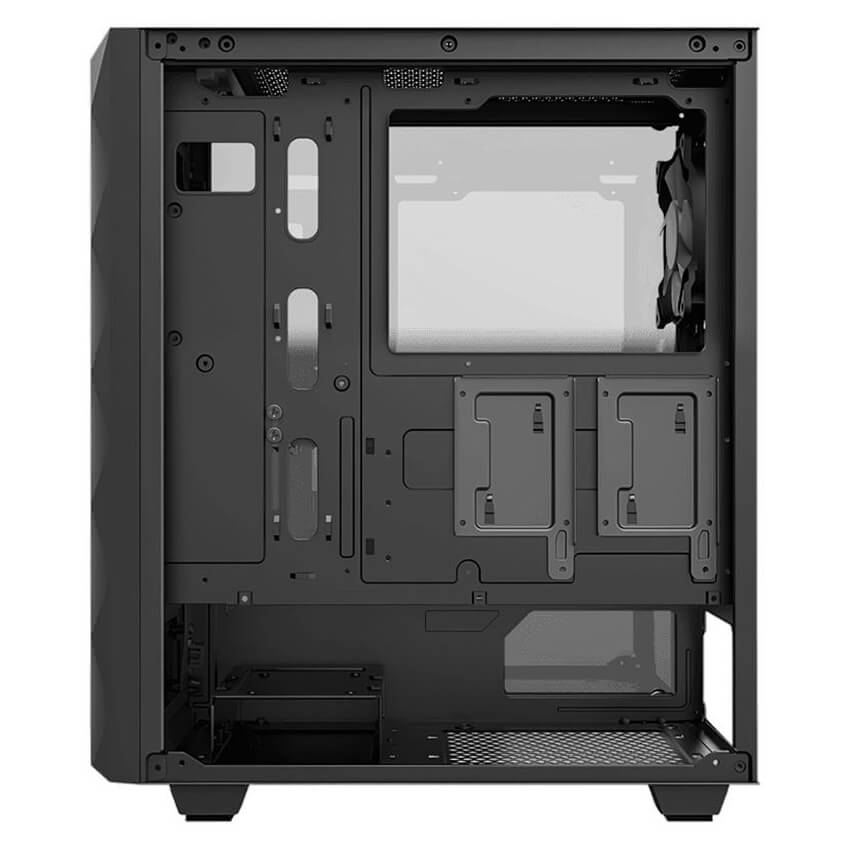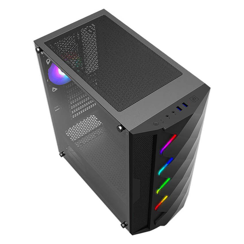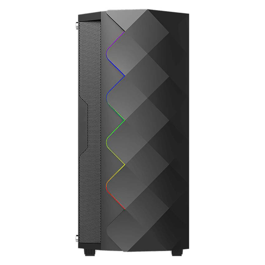 Gabinete Mid-Tower con ventana, soporta motherboards ATX / Micro ATX / Mini ITX, sin fuente, LED RGB frontal.