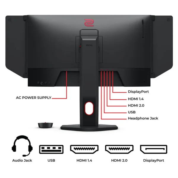 ZOWIE XL2546K incluye tres entradas HDMI 2.0 y DisplayPort 1.2 para una gran versatilidad. Su base, que ahorra espacio, puede configurarse en múltiples ángulos, lo que le permite sentarse más cerca de la pantalla a la vez que optimiza el espacio del escritorio. La altura, la inclinación y el giro de la pantalla se pueden ajustar para ofrecer la máxima comodidad. Además, también se puede inclinar 90° para ver documentos en modo vertical o para una configuración multimonitor mediante los orificios de montaje VESA de 100 x 100 mm.