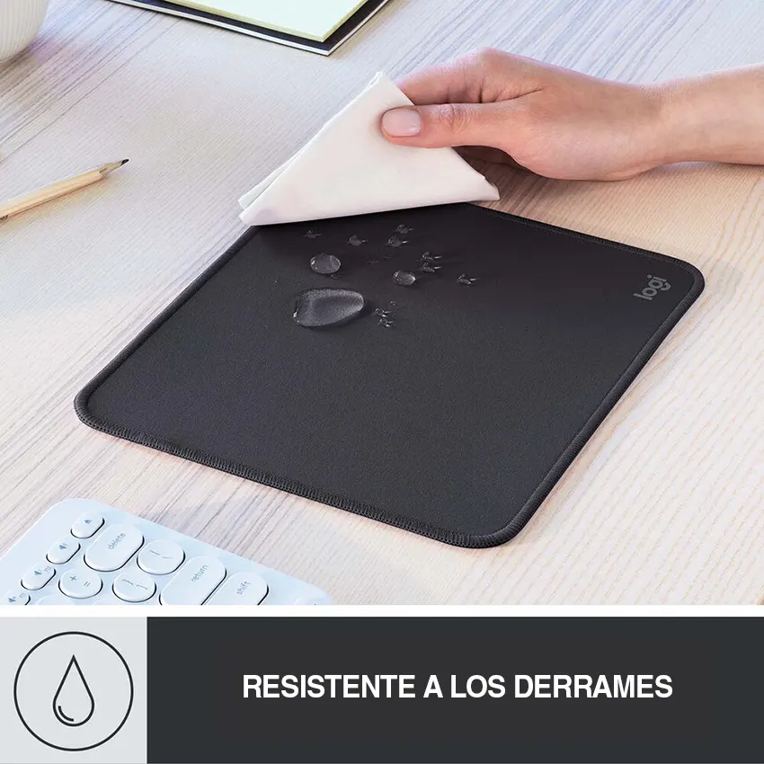 La alfombrilla de mouse Logitech posee un recubrimiento a prueba de salpicaduras que resiste posibles percances, permitiendo limpiar fácilmente líquidos derramados.