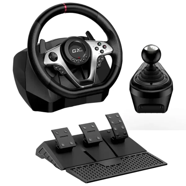El Genius SpeedMaster X1 incluye un volante con giro de 900° y 270°, y una palanca de cambios manual de 6 velocidades para un control mejorado del juego.